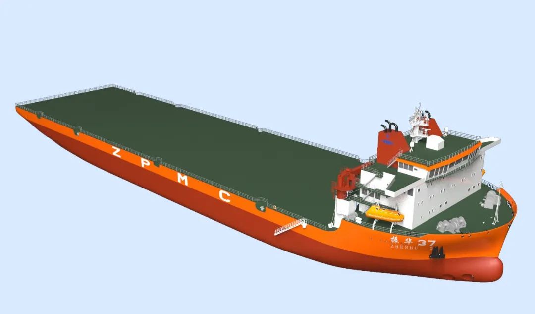 該項(xiàng)目總長170米,型寬40米,型深10.5米,箱形船體,直角船尾,舭部斜角、縱骨架式、單連續(xù)甲板鋼質(zhì)焊接結(jié)構(gòu),艉部采用2套吊艙拉式推進(jìn)器作為主推進(jìn)裝置,服務(wù)航速下續(xù)航力大于18000海里,具備艉部與兩舷側(cè)滾裝滾卸功能,滿足無限航區(qū)調(diào)遣作業(yè)要求,具有甲板面積大、作業(yè)水深大、抗風(fēng)等級強(qiáng)等優(yōu)點(diǎn),是振華重工自建的第一艘3萬噸級甲板船。